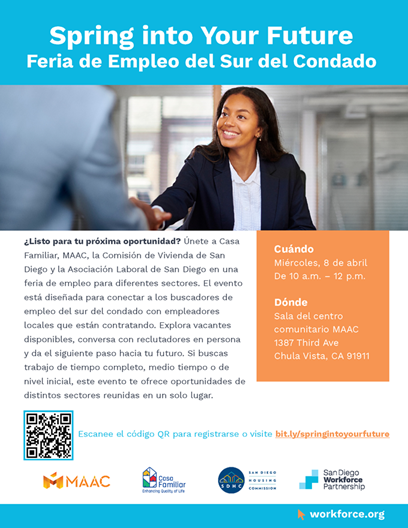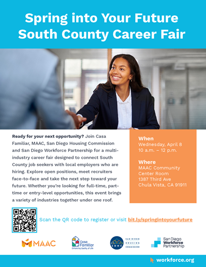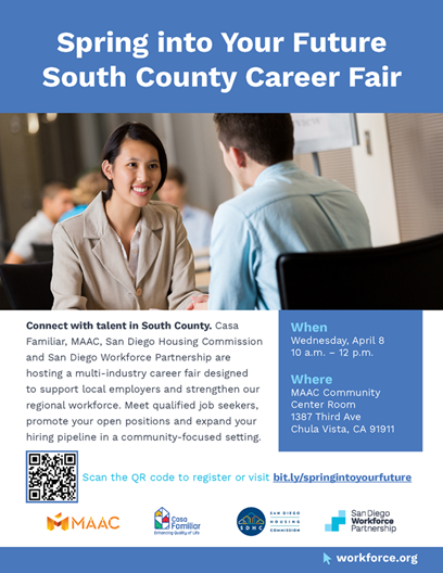MAAC, Casa Familiar, San Diego Housing Commission and the San Diego Workforce Partnership are collaborating together to bring you into this space to connect with local talent in the community. This is an event designed to bring together San Diego County employers and San Diego County employment opportunities with local talent. We’re inviting employers from all industries to participate and engage in this impactful event at no cost. This career fair will be an ideal opportunity for employers to showcase your business and recruit local talent and build your workforce pipeline. This event is your chance to connect with local talent eager to learn and apply for employment opportunities. |